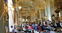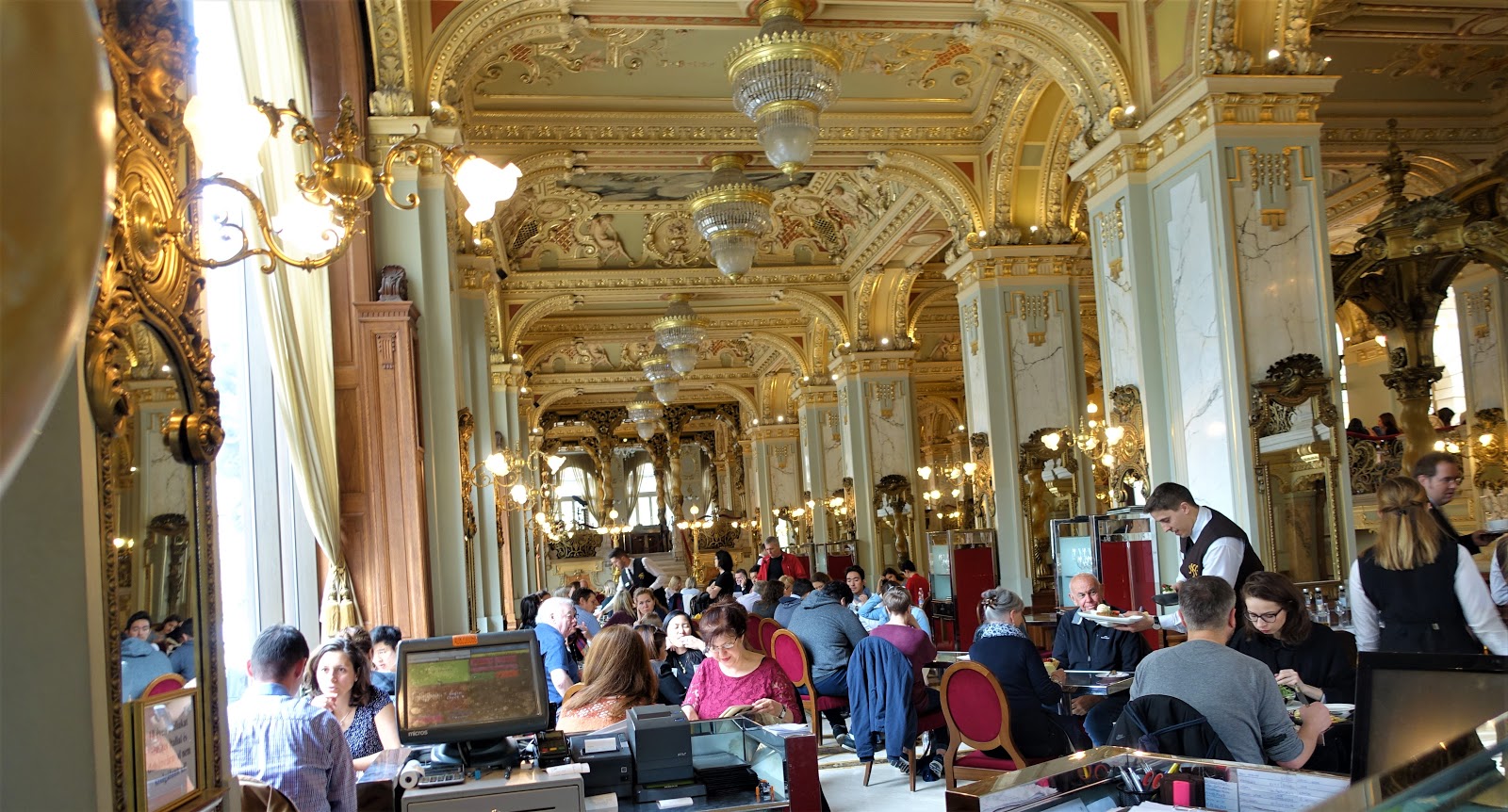 Jag lyckades hitta fram till New York Cafe som var alldeles för ”komplicerat” för min smak. Ett fd palats med guld på hela insidan och priser därefter. Jag nöjde mej med att ta några bilder, det är trots allt Budapest äldsta café, och gick snabbt ut igen. Dessutom var det nästan fullsatt trots att det var ganska tidigt på förmiddagen. Nu har jag iaf sett det!