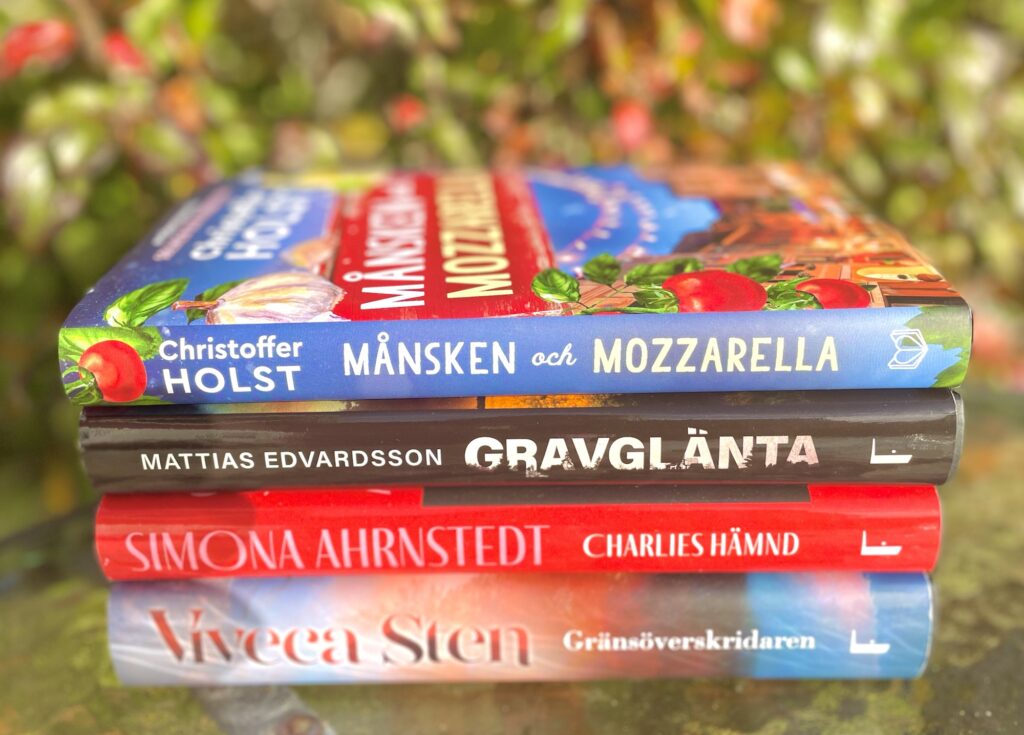 En härlig bokhög! Här finns både mys, spänning, drama och kärlek av fyra riktigt bra författare. Man vet lixom redan när man ser boken att det blir några timmars härlig underhållning. Två av dem kommer bara inom någon vecka med sina förutsättningar, Sten kommer förmodligen med sin nästa höst om allt är som vanligt. Holst kommer också med nytt snart, men ingen fortsättning på denna, utan något helt annat.