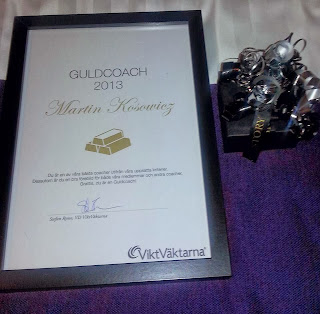 Som ni kanske kommer ihåg så var jag ensam i helgen medan Martin var på personalmöte med Viktväktarna. En av punkterna för hans del var lördagens festmiddag där det skulle utses Guld- resp Diamantcoach. Det innebär att man har stora klasser, får folk i mål och lite andra parametrar. Diamantcoachen är helt enkelt den som är allra bäst. Självklart hoppades vi på det sistnämnda.