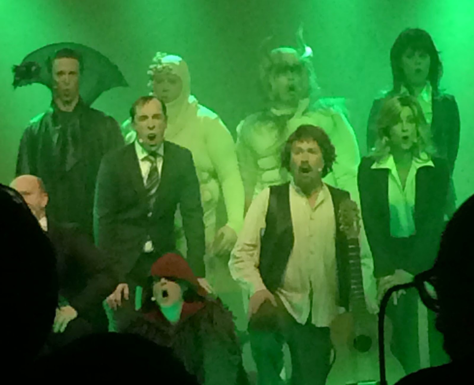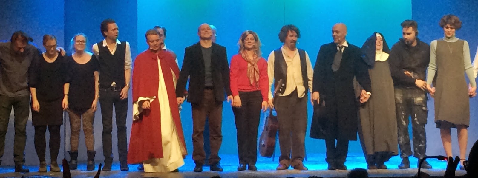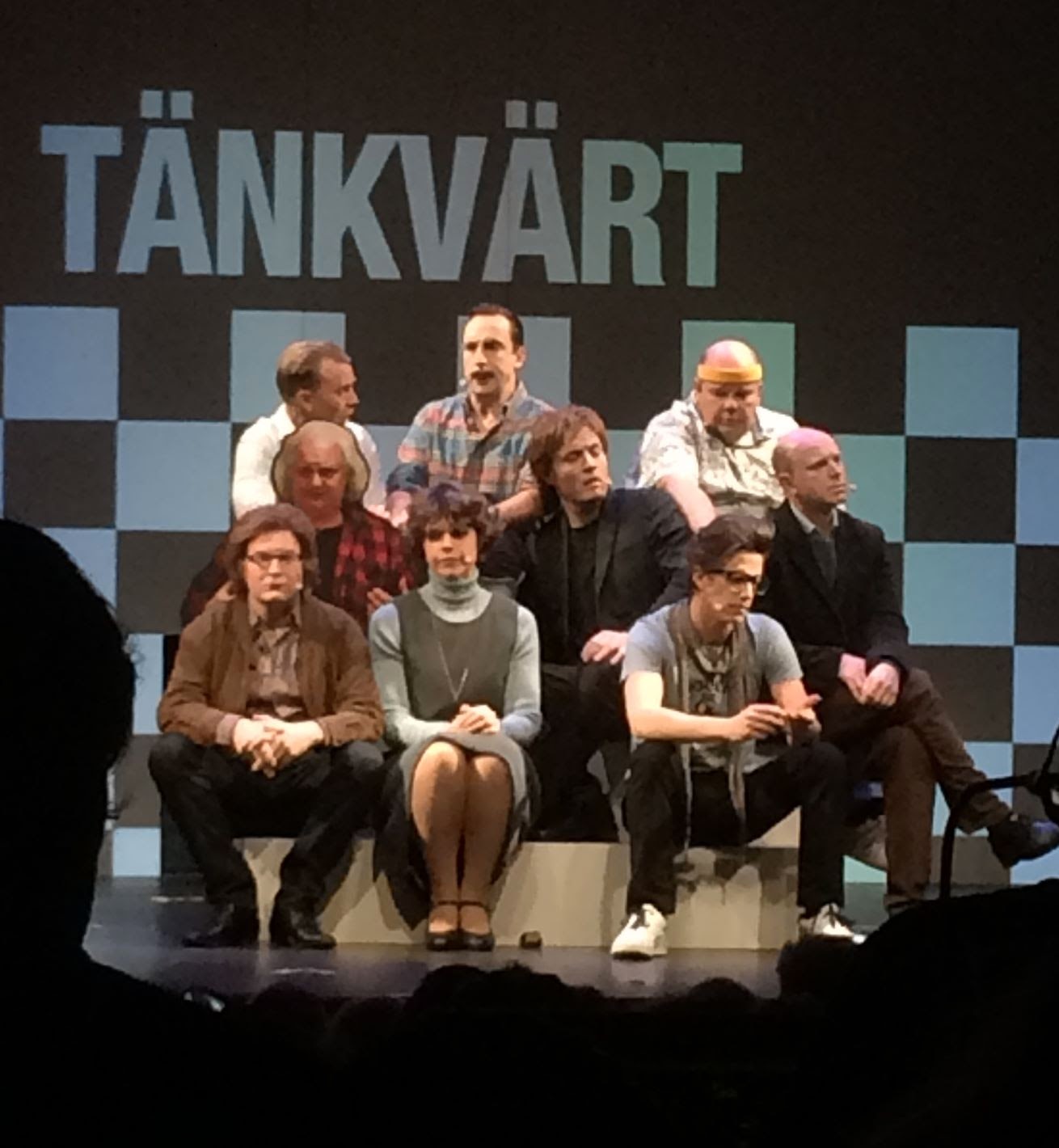 Det var första publikrepetitionen och fritt att sitta var man ville. Om ni kan så ska ni sitta på ytterplatser, längre fram på höger sida, men jag säger inte varför… Vi hittade fyra platser tillsammans nästan längst bak. Trots att jag är kort så funkade det hyfsat. Eftersom det inte finns några pressbilder från föreställningen än, så frågade jag om det var ok att ta bilder till bloggen och fick tillåtelse att fota så mycket jag ville. En och annan skalle får ni stå ut med. Jag kommer att lägga ut pressbilder på magasinet under nästa vecka som bättre visar vad vi faktiskt såg och var med om.