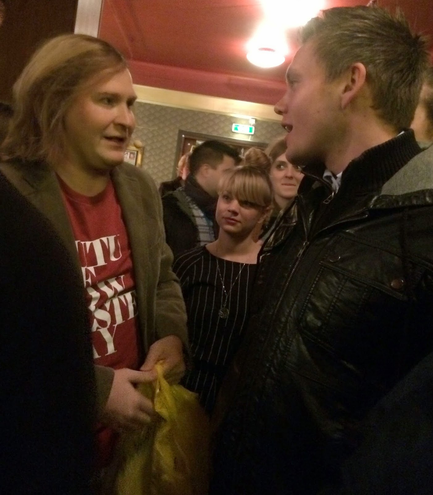 Showen började redan i foajen. Där kom en ”taxichaufför” och trängde sej genom folkmassan medan han efterlyste den som förbeställt en bil. En stund senare gick det runt en man och frågade efter smör… den mannen började prata med Junior som är ett stort fan av allt Grotesco hittills gjort. Så när mannen (Dorsin) frågade om smör fick han till svar att det bara fanns ett kilo mjöl. Ni som sett klipp på youtube och kommer att se föreställningen förstår vad han menar. Mer säger jag inte om den saken.