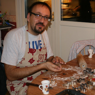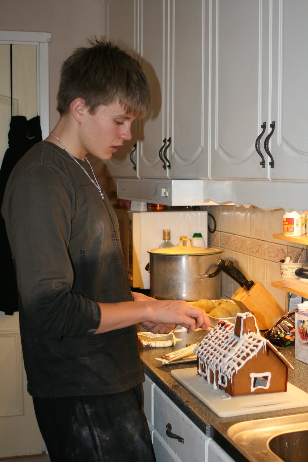 Efter lunch röjde vi kökbordet och årets pepparkaksbak tog vid. Det blev ett gäng plåtar och ganska mjöliga pojkar 🙂 Vem har sagt att tonåringar inte tycker om att baka? Inte jag! Killarna sparade lite deg så att Martin också fick baka lite. Så fixade han några extra flodhästar till sin samling. Under tiden satte jag ihop pepparkakshuset. Vi köper färdiga delar och ”limmar” bara ihop det själva. Sen får ungarna dekorera det. Efter lite trassel blev det till slut ett pyntat pepparkakshus som nu står på sin plats bland tomtarna.