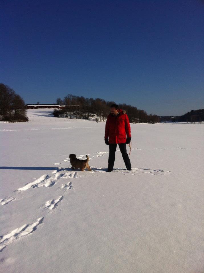 Eftersom vi gick en sträcka med backar igår och jag kände av mitt knä lite grann, så valde vi att gå på platt mark hela vägen idag och då finns det en himla bra sträcka runt Alfa Laval som är 4,5 km ungefär. Så den tog vi. Baileys var överlycklig, för på vägen finns ett ställe som han får springa fritt på. Men han fuskade! Det var ju en 20-30 cm snö där och förstås lite jobbigt att springa i, så han hoppade upp på vägen istället. Trodde han ja! Vi ropade tillbaka honom så han fick lite att jobba med 🙂