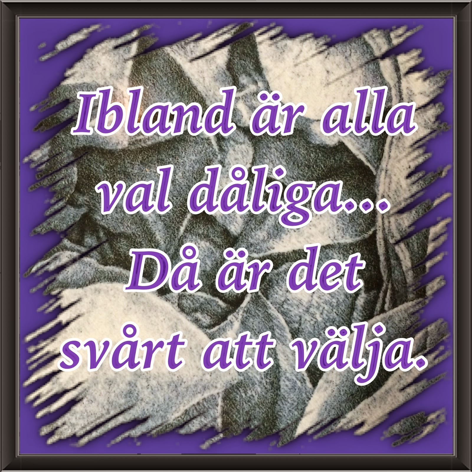 Utåt syns det säkert inte, själv ser jag hur ögonen är röda och trötta, hur eksemen på händerna blir allt större och hur svullen kroppen är. Jag brukar ju säga att man alltid har ett val och det har man! Men ibland är det svårt att välja och det känns som vad man än väljer så blir det inte bättre. Så är det idag. Väljer jag att vila och ta hand om mej, så kommer jag ännu mer efter. Väljer jag att ta en skrivardag, så blir jag tröttare. Väljer jag att städa, så hinner jag inte skriva… vad jag än väljer så är det fortfarande massor kvar att göra. Å hur jag än gör så förstör jag Martins lediga helg genom att vara på dåligt humör och förstöra hans lediga tid med en massa grejer som han måste göra för min skull.