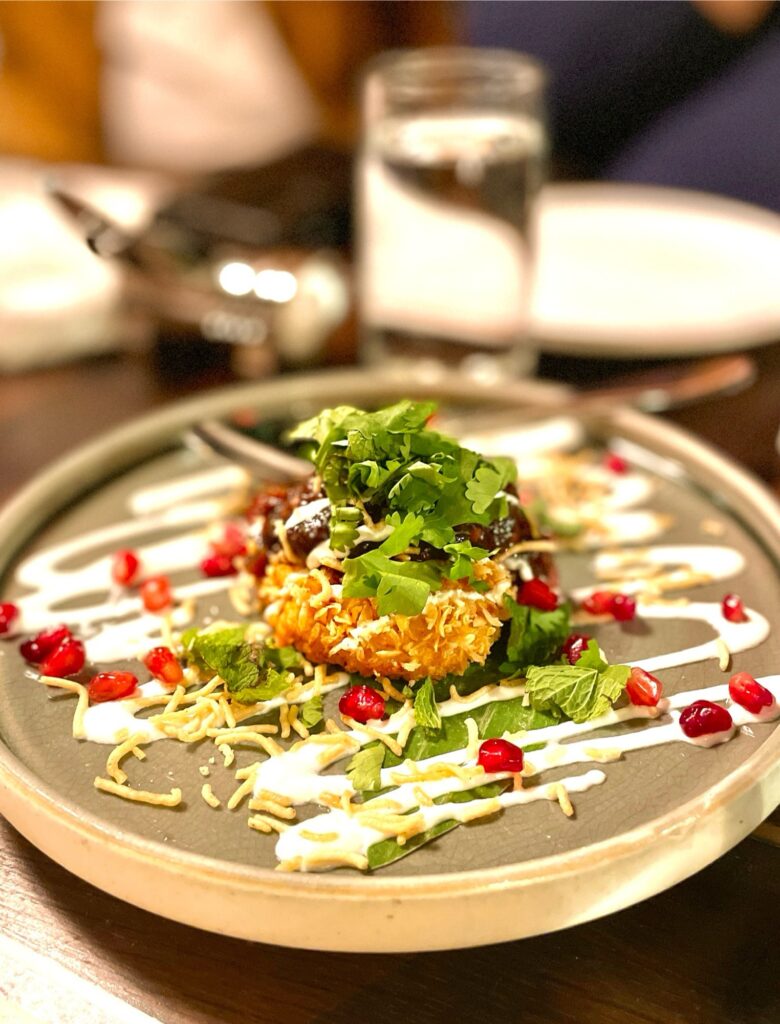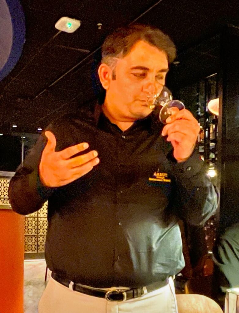 Vi fick smaka fyra olika sorter, alla i sällskap med Amruts whiskyambassadör, som jag tyvärr glömt namnet på. Till dryckerna serverades även indiska små smakportioner, den ena godare än den andra. Vi började med Amrut Bagheera – lagrad tre år på bourbonfat och sex år på Oloroso sherryfat. Till den serverades aloo chaat som är en friterad sötpotatis med yoghurt, tamarind, granatäpple och mynta.