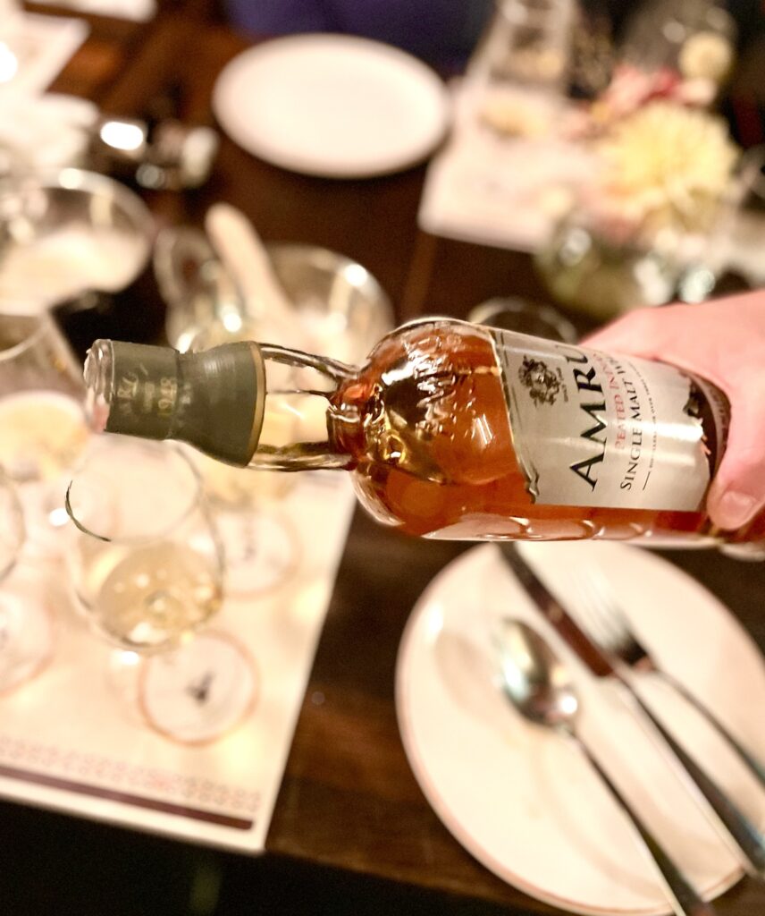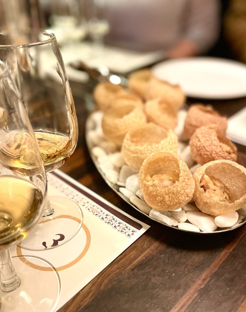 Som avslutning bjöds vi på Amrut Peated, nu snackar vi rökig whisky. Till den fick vi pani puri, som är ett populärt street food som säljs överallt i Indien. Det är spröda bollar fyllda med olika saker, våra med potatis och kikärtor, som toppas med en sås. Bollen ska sedan ätas hel för att få alla smaker på en gång, vilket kan vara lite knepigt – för även om bollen är lite så är den inte sååå liten.