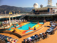 Uppe på plan 11-12 hittar vi ett SPA och ett fitnesscenter, de har alltså två våningar. På 11 har vi ett inomhusbad med utomhuskänsla, typ en relaxavdelning med bubbelbad och pool. Här finns även ett litet café där man kan äta lättare måltider och snacks. Å utanför dörrarna ligger huvudpoolen, med bubbelbad, bar, solstolar och storbildsskärm med film. Längst fram på plan 11 ligger bufférestaurangen Windjammer, där vi oftast äter vår frukost. Men här kan man även äta lunch och middag i bufféform.