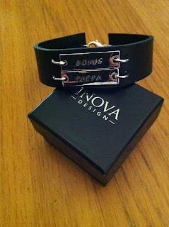 För några månader sedan såg jag en bild på Instagram på ett otroligt läckert armband som skulle passa Martin perfekt. Det var i läder och hade som silverplattor där man kunde få vilken text man ville. Jag visade bilen för sönerna som var med på noterna direkt! Texten dividerades lite mellan killarna, att det skulle stå något med pappa eller farsa var givet. Det stod mellan Bonus Farsa, Bonus Pappa eller Farsan Baloo. Till slut föll valet på Bonus Pappa, ett ord på varje platta.