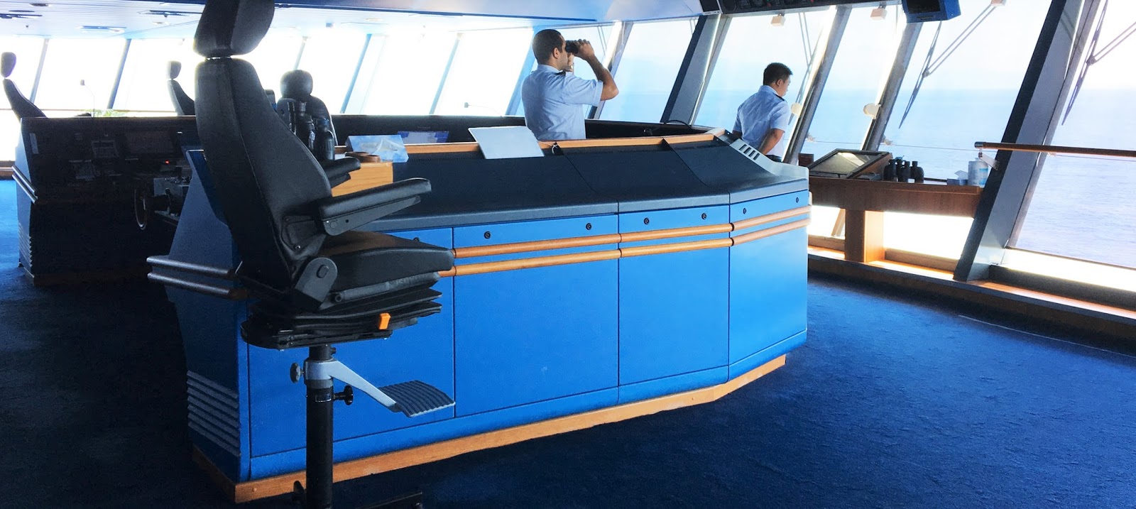 Först var vi inbjudna till kaptenen och kommandobryggan. Vi skulle möta Susana i receptionen som skulle följa med oss upp. Upp och upp förresten, kommandobryggan låg på samma däck som vi bodde. Vi kunde se in när vi satt på balkongen och hade lite koll på vad som hände där. För Susana var det andra gången hon skulle gå dit så hon tyckte det var jättespännande att följa med oss.