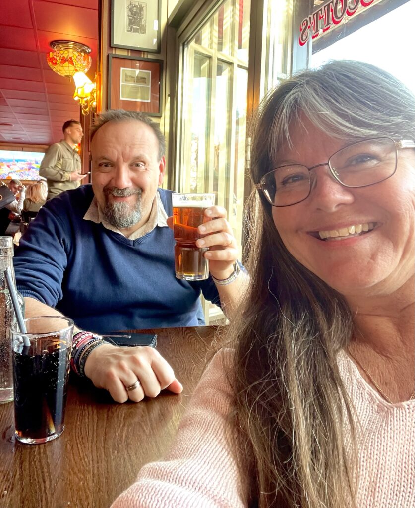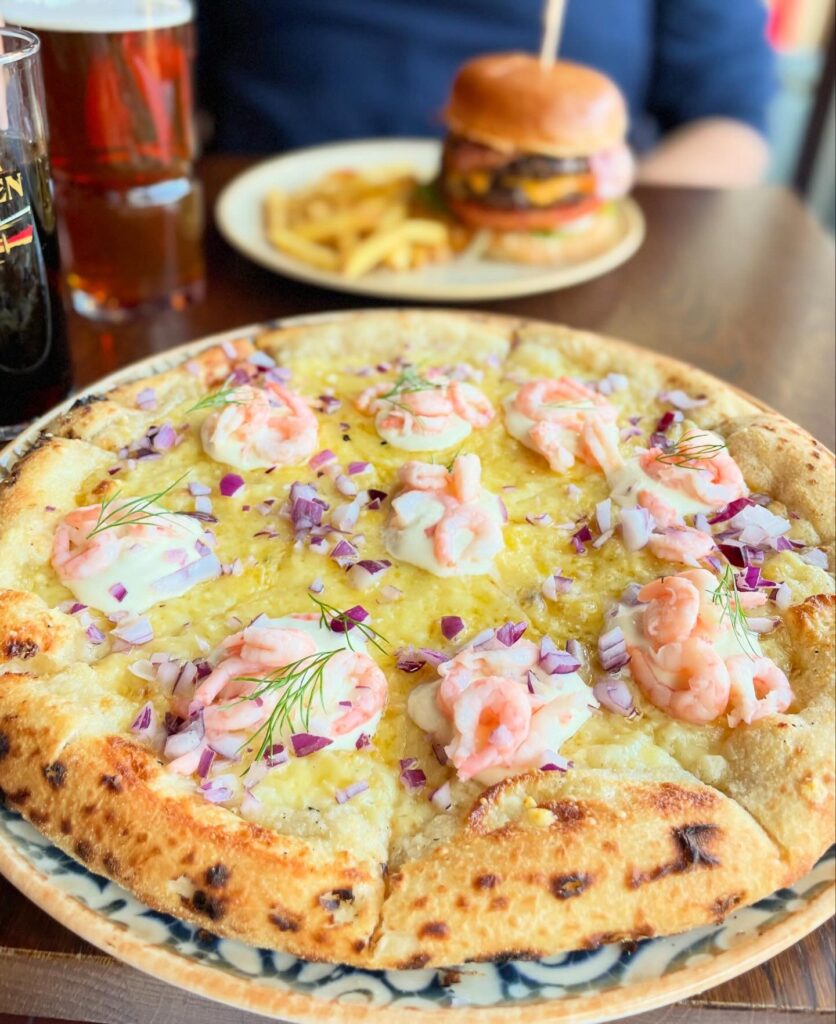 När Martin slutade jobba gick han den korta biten och satte sej hos mej en stund. Sen tog vi lite fler bilder och gick in på restaurangen för att äta. Vi har varit här förut och vet att de har superba pizzor. Jag äter aldrig kanten, för att den alltid är för torr. Här äter jag allt. Martin tog en hamburgare och jag tog en vit pizza med västerbottensost, räkor och rom. Den är så god att man bara smäller av.