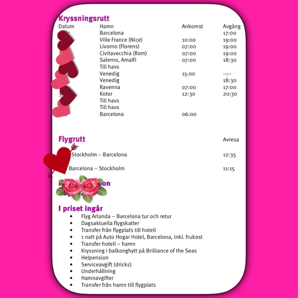 Så vi har skickat några förfrågningar och nu börjar det komma förslag. Den ni ser här brevid är det som låter mest lockande just nu. Stopp i bla Rom, Venedig och Nice, start och slut i Barcelona. 12 dagar till havs och hytt med balkong. Perfekt!