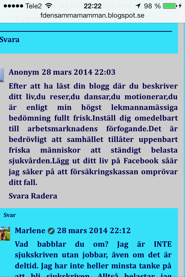 ”Anonym” hade bara kunnat fråga ”Är du sjukskriven eller?” Så hade jag kunnat svara på det. Istället är Anonym riktigt irriterad och upprörd över något som inte är riktigt och som h*n tagit ur luften. Å så där fortsätter det några kommentarer till… jag är uppenbarligen en parasit i samhället, som utnyttjar allt och alla. OCH jag är inte det minsta sjuk utan borde nog sluta känna efter… eller nåt…