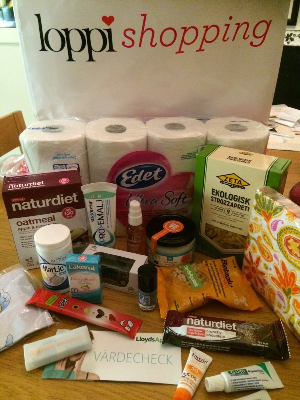 Jag hade famnen full redan innan allt startade så goodiebagen vi fick när vi skulle gå var välkommen. Den redan fullpackade bagen blev ännu fullare när jag tömde allt jag hade sedan innan. Det är alltid lika spännande att se vad man får med sej hem. Den här gången var det ekologiskt bröd, en ny propoud (som var fantastiskt god), tvättmedel från Neutral, vitaminer, mussli från Pauluns, duplo och en massa annat. Nu ska allt smakas och testas!