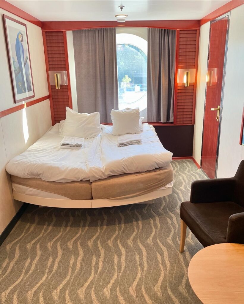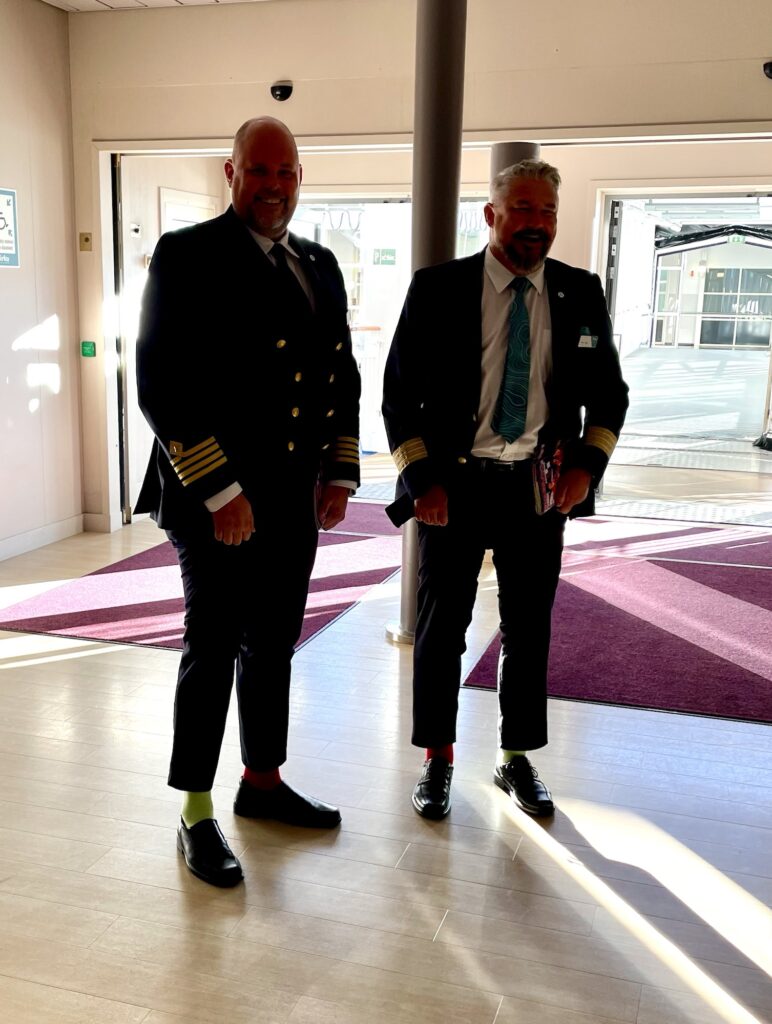 16.30 släpptes passagerarna ombord. Då stod vi tillsammans med personalen precis innanför dörrarna. Vi filmade medan de hälsade alla glada ”Diggilooare” välkomna ombord. Fartyget var fullbokat och fick en medelålder på typ 75+. Det var ovanligt många rullatorer och käppar och blev rätt trångt efter ett tag. Snart hade alla hittat sina hytter, även vi, och då körde programmet igång.