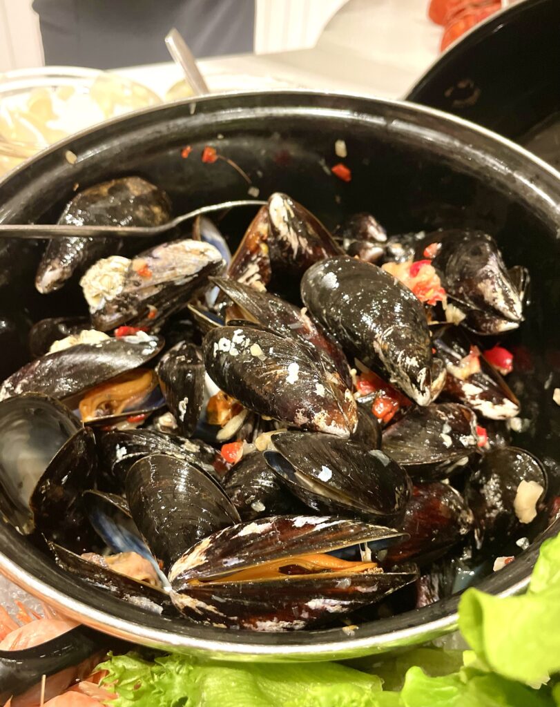 På Backstage (däck 5) var de stora Diggiloo-showerna, tre stycken efter varandra. Gästerna hade armband i olika färger som visade när just deras show skulle vara och när de hade sin middagstid. Smart! Vi hade sk presskort och kunde glida runt lite som vi ville. Äta hann vi knappt. Det blev en skaldjursbuffé i omgångar kan man säga. Vi åt lite, sprang iväg och filmade, åt lite till och sprang iväg igen. Det vi fick i oss var iaf väldigt gott. Birka är bra på skaldjur!