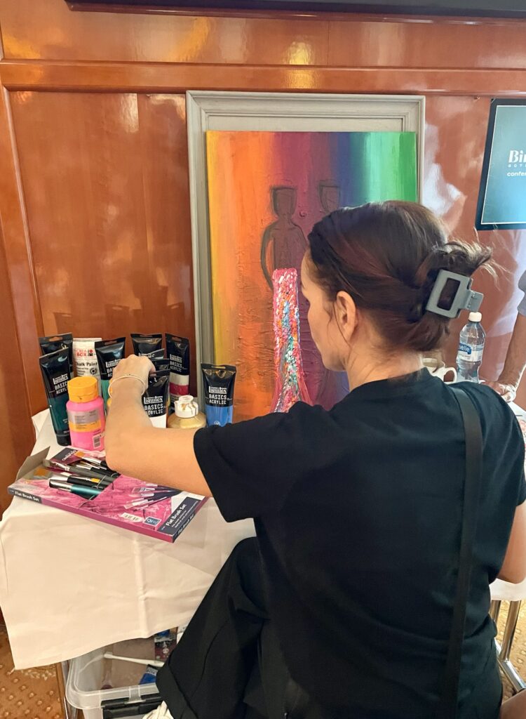 I konferensen rullade en film om åren med Diggiloo, som man kunde titta på när man ville. Där fanns även en liten shop med sk merch, affischer, tröjor, muggar mm, produkter för fans helt enkelt. Här var dessutom en liten konstutställning med tavlor målade av Jessica Andersson och Linda Bengtzing. Linda satt även om målade tavlor på plats under fredagen. Medan Magnus Carlsson hade vinprovning i tax-free. Det vita var riktigt gott 🙂