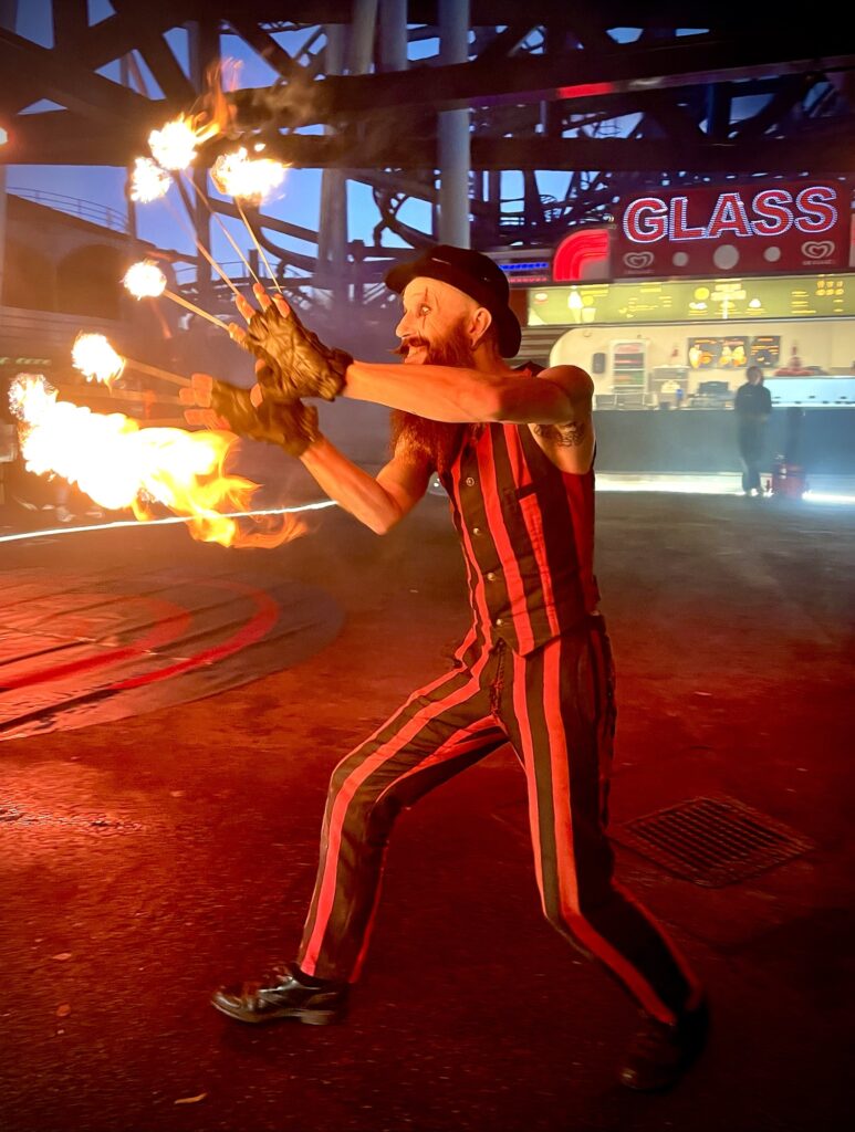 När vi kom dit igår var det fortfarande ljust. Vi bjöds på eldshow och spökparad, men sånt gör sej ju bäst i mörker. Vi orkade dock inte vänta tills mörkret lagt sej och lite till, det var några timmar till kvällsshowerna. Men vi utnyttjade tiden bäst vi kunde medan vi var där. När bara 200 pers har Grönan för sej själva hinner man rätt mycket. Vi hade dessutom två timmar på oss att filma inne i spökhusen. Något som annars är absolut förbjudet.