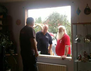 Klockan 8 kom hans två arbetskompisar hem till oss och började med att riva ur det första fönstret som skulle bytas. När de såg hur mycket mindre det nya fönstret var ringde de Tomten som fick köpa virke på vägen. Under tiden drog de loss de andra två fönstrena också… snacka om luftkonditionering! Tur vi tänkte till och inte gjorde detta på vintern. Så kom Tomten med virket och då blev det fika, det blir mycket fika när Tomten är med…