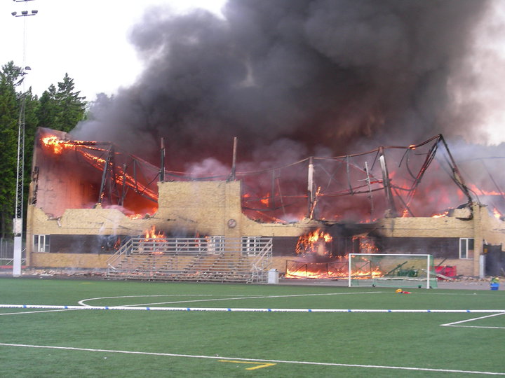 Väl hemma ser jag att en vän skrivit på sin facebook att skolan brinner. I skolan ligger vår skyttehall!!! Vi tittar ut och ser en rökpelare som ser ut som hiroshima-svampen. Kolsvart och täcker