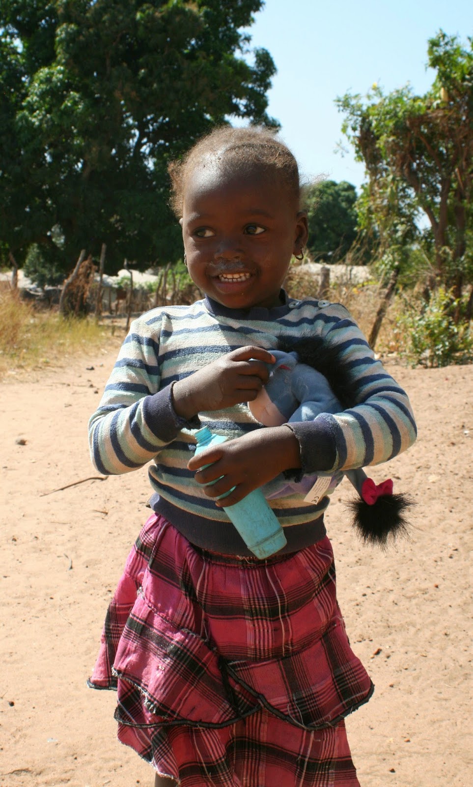 Kommer ni ihåg flickan på bilden? Hon bor i byn Juffure i Gambia, byn där Kunta Kinte föddes. Vi träffade henne när vi var där i januari förra året och gav henne ett gosedjur. Det var hennes första köpta leksak och hennes första egna ägodel. Hon sprang runt hela byn lyckligt gallskrikande och visade upp sin skatt 🙂