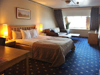 När vi klev på Viking Cinderella vid 17-tiden visste vi bara att vi skulle bo i en lite större hytt, äta a la carte till middag och buffé till lunch dagen efter. Precis som på de andra kryssningarna. Vi gick på, hittade vår hytt och låste upp… sen tappade vi hakorna och tvärstannade på tröskeln. Hytten, eller rättare sagt rummet som är en mer rättvis benämning, var nästan lika stort som sonens lägenhet! 29 kvm, längst fram i mitten på fören och med ett stort badrum med golvvärme. Kanonfint helt enkelt!